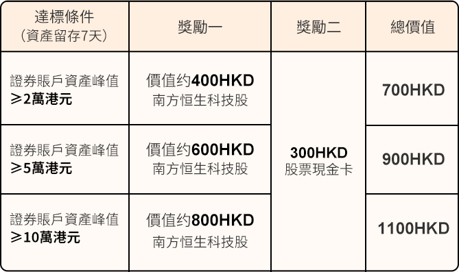首次入資禮:開戶後從未入過資,活動期間首次入資/轉倉資產達標,可獲得以下獎勵
